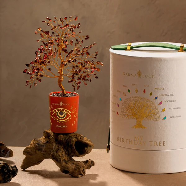 Dreams are reached by aligning with your truest nature. Thoughtfully designed for all the passionate souls born in January. this special birthday tree is made with fiery Garnet leaves and is painted with a protective Evil Eye. The beautiful birthstone of January. Garnet. is a powerful stone that helps to keep these motivated individuals feeling energized and empowered. Perfectly matched to their unique vibration. give your loved one the Ambitious Spirit Garnet January Birthday Tree to inspire their vision.