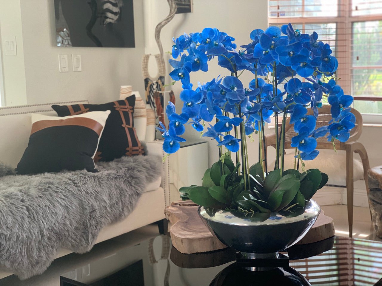 Graceful and exotic. the phalaenopsisorchid has symbolized integrity. nobility. and luxury for centuries. Our enduring. blue phalaenopsis arrangement captures the artistry and spirit of natural orchids. It’s prized for its profusion of perfect blooms. Vertical bamboo stakes. broad green leaves. and a genuine moss base add to the realism of this arrangement.Often called the moth orchid. the phalaenopsis is a favorite among our designers for its dense leaves. elegantly arching sprays and lovely blooms. Our remarkably lifelike arrangement is staked into a moss-covered silver avenue bowl for a timeless. authentic look that will endure for years to come. This arrangement is just the right size and is versatile enough to use as a coffee table centerpiece. a dining room or console table. It has a luscious tropical feel that will add vibrancy and elegance to any room.